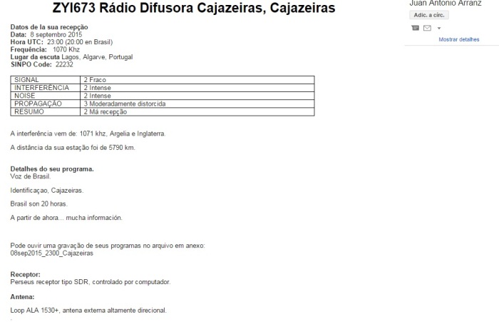 Ele encaminhou relatório de frequência da Rádio Difusora e áudio gravado num rádio em Portugal do programa ‘Voz do Brasil’, além de justificar que há interferência no sinal vindos da Argelia e Inglaterra. A distância da estação paraibana segundo o especialista é de 5790 km.