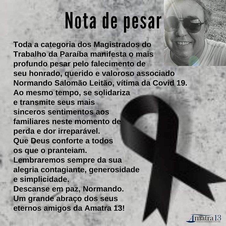 A Associação dos Magistrados do Trabalho da 13.ª Região emitiu uma nota de pesar pela morte do juiz; confira: