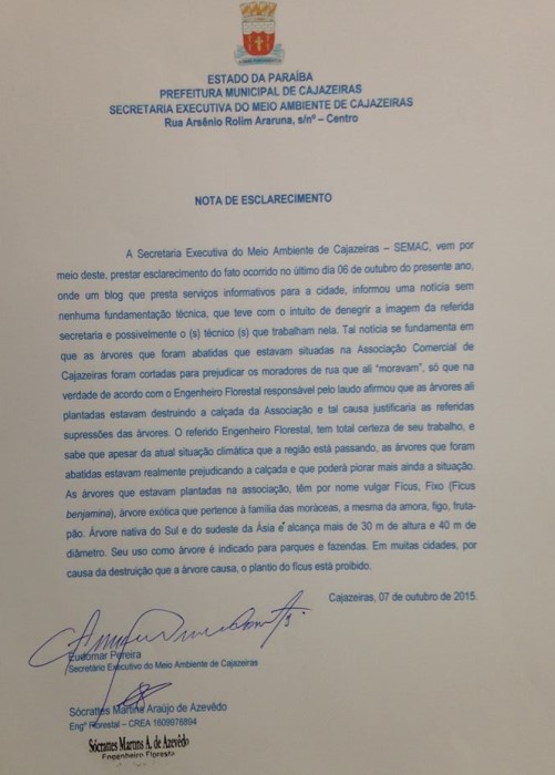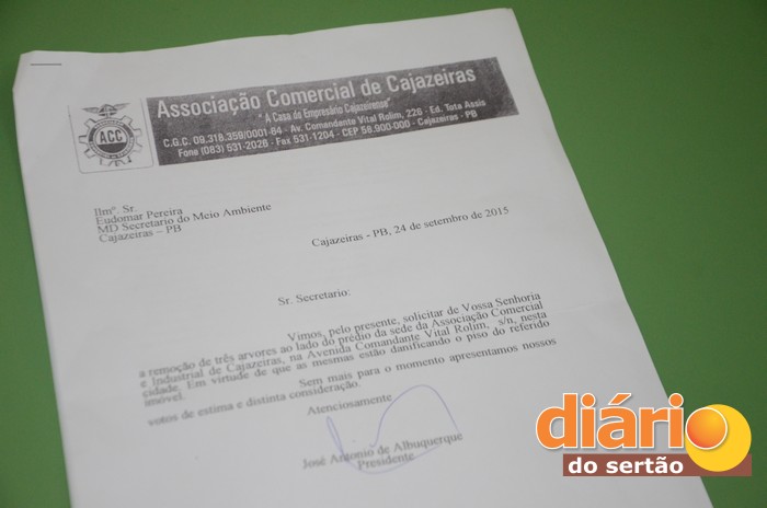 De acordo com o secretário Eudomar, o Meio Ambiente recebeu um ofício da Associação Comercial de Cajazeiras, em nome do presidente José Antônio de Albuquerque, solicitando a retirada de três árvores. “A Secretaria analisou através do engenheiro florestal e foi observado que as árvores estavam prejudicando o imóvel, comprometendo o piso”, disse.