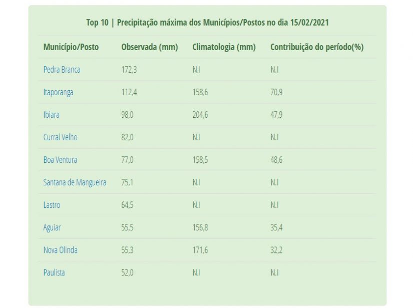 Outras cidades também registraram boas chuvas. A exemplo das cidades de Itaporanga registrou 112,4 mm, Ibiara 98 mm, Curral Velho 82 mm e Boa Ventura 77 mm.