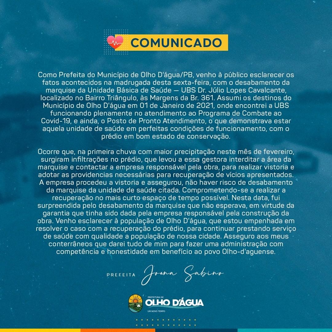 Segundo esclarecimentos feitos pela prefeita Joana Sabino através de uma nota publicada nas redes sociais, a marquise da Unidade Básica de Saúde Dr. Júlio Lopes Cavalcante, no bairro Triângulo, cedeu por causa de infiltrações, mas ninguém ficou ferido.