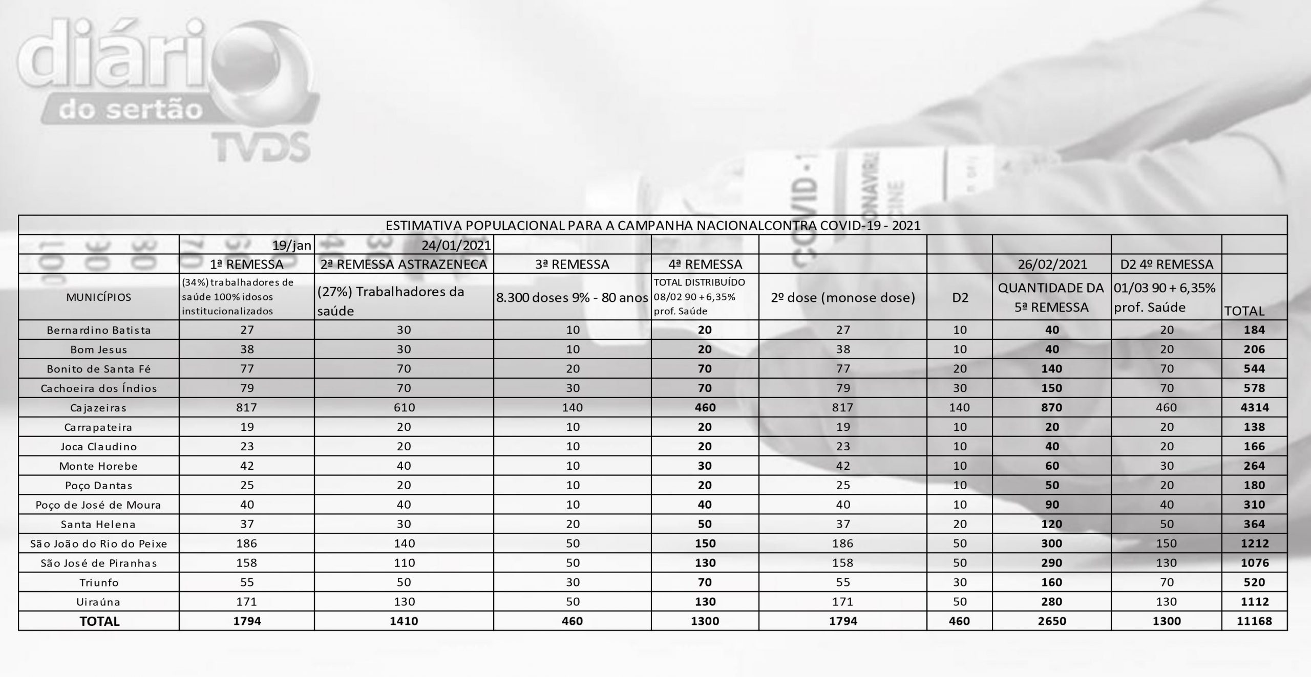 A 9ª Gerência Regional de Saúde, que compreende os quinze municípios da região de Cajazeiras, no Alto Sertão paraibano, já recebeu da Secretaria de Estado de Saúde cinco remessas de vacinas contra a Covid-19. Ao todo, já foram distribuídas 11.168 doses dos imunizantes do Butantan e da AstraZeneca.