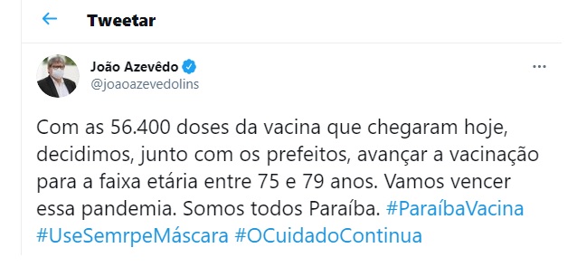 “Com as 56.400 doses da vacina que chegaram hoje, decidimos, junto com os prefeitos, avançar a vacinação para a faixa etária entre 75 e 79 anos. Vamos vencer essa pandemia. Somos todos Paraíba”, escreveu o governador nas redes sociais.