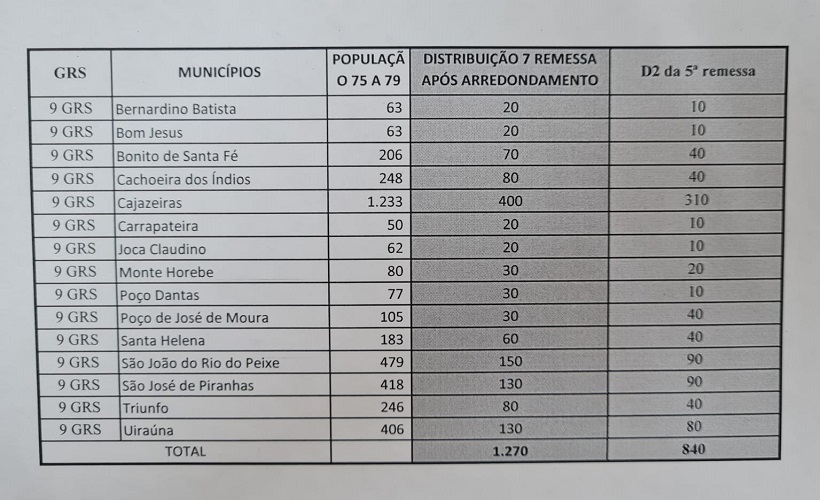 Cajazeiras, o maior município da região, recebeu o maior número de doses da 7ª remessa (1.233), enquanto que Carrapateira tem o menor número (50). As doses serão aplicadas na população com idade de 75 a 79 anos.