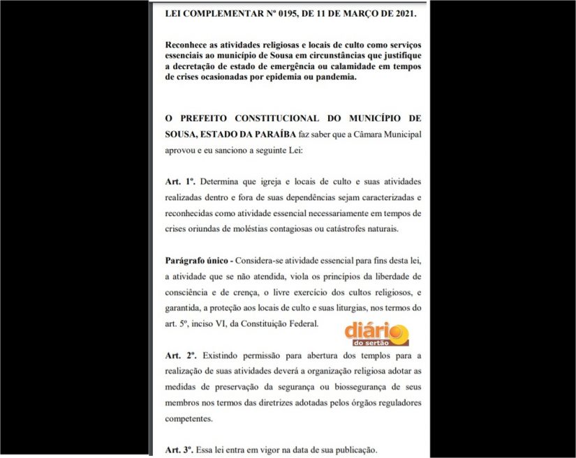 O Artigo 1º da Lei Complementar nº 0195 determina que igreja e locais de culto e suas atividades realizadas dentro e fora de suas dependências sejam caracterizadas e reconhecidas como atividades essenciais necessariamente em tempos de crises oriundas de moléstias contagiosas ou catástrofes naturais.