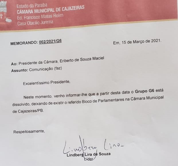 Nesta segunda-feira, o vereador Lindberg Lira (Cidadania) enivou ao presidente da Câmara de Cajazeiras um memorando comunicando que o G6 foi dissolvido. A extinção do grupo acontece horas depois do vazamento de um áudio de Whatsapp em que o prefeito José Aldemir demonstra irritação com alguns vereadores que ele considerava serem da sua bancada de apoio na Câmara Municipal. No áudio enviado ao vereador Alysson Voz e Violão (Cidadania), o prefeito disse que não vai se submeter ao G6.