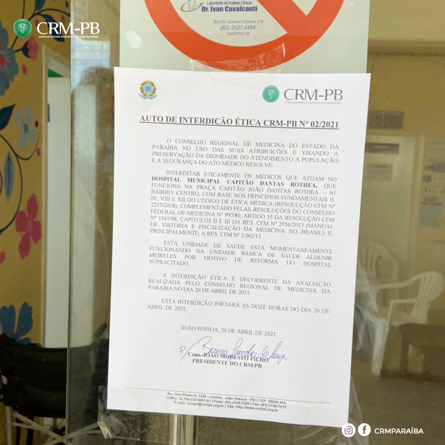 O Conselho de Medicina do Estado da Paraíba interditou eticamente, nesta terça-feira (20), o Hospital Municipal Capitão Dantas Rothea, localizado no município de São João do Rio do Peixe. O hospital está funcionando provisoriamente nas dependências da Unidade Básica de Saúde Aldenir Meireles em virtude de uma reforma. Durante a fiscalização, foi identificado que o serviço não dispõe de escala médica completa e diretor técnico nomeado.