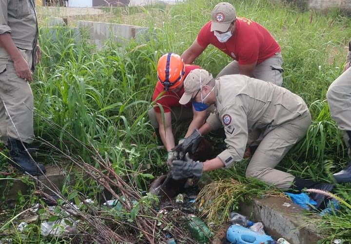 Depois de alguns minutos e muito esforço físico, os bombeiros conseguiram puxar o animal, que saiu atordoado, mas sobreviveu.