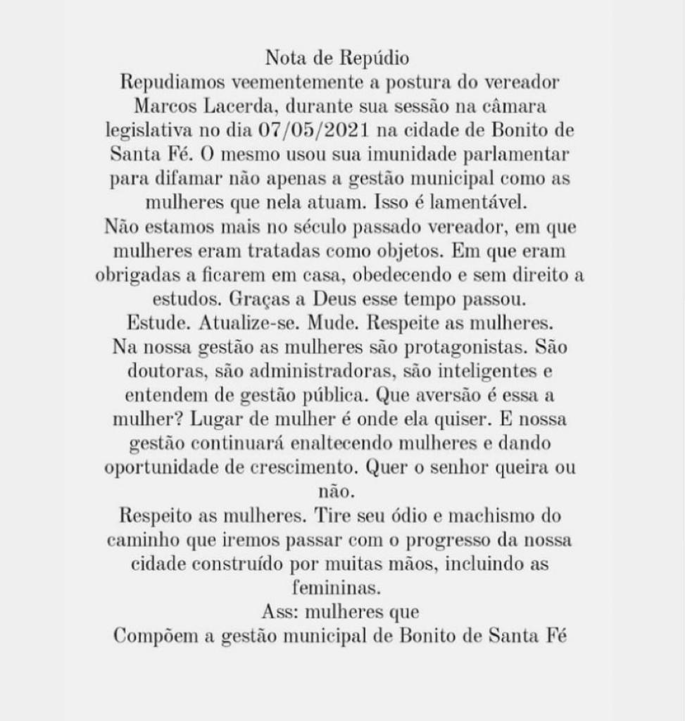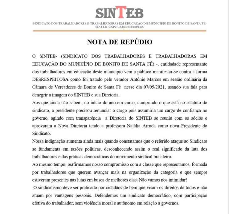 O Sindicato dos Trabalhadores e Trabalhadoras em Educação do Município de Bonito de Santa Fé (SINTEB) e as mulheres que compõem a gestão municipal emitiram notas de repúdio contra o vereador Marcos Lacerda (PSB) após discurso na tribuna da Câmara, na sessão de sexta-feira (07), em que ele acusa o SINTEB de ser ligado ao governo municipal e afirma que Bonito de Santa Fé está sendo mal administrado por mulheres e não pelo prefeito.
