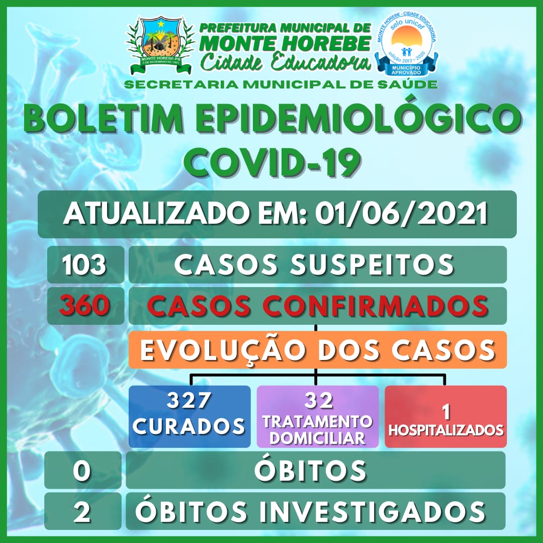 O boletim epidemiológico desta terça-feira (1º) mostra que desde o início da crise sanitária, a cidade contabiliza 360 casos confirmados, dos quais 327 já se recuperaram da Covid-19. Sem nenhuma morte pelo coronavírus, Monte Horebe investiga dois óbitos de pacientes que testaram positivo e que aguardam análise da Secretaria de Saúde do Estado.