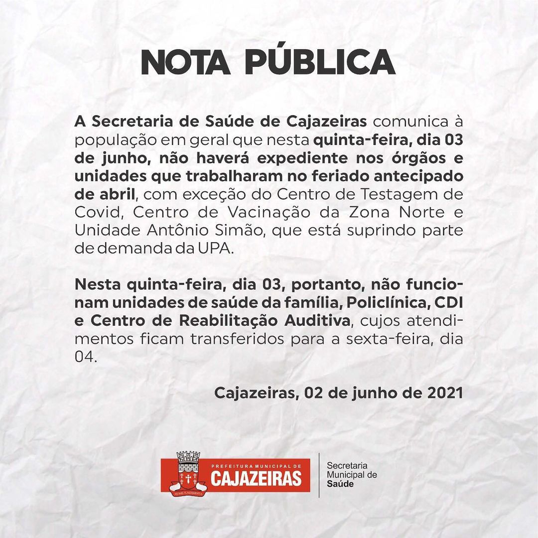 Em postagem feita no Instagram há cerca de 8 horas, a Secretaria de Saúde informa que não há atendimento nos órgãos e unidades que trabalharam no feriado antecipado de abril, com excessão dos órgãos que estão suprindo demandas da UPA.