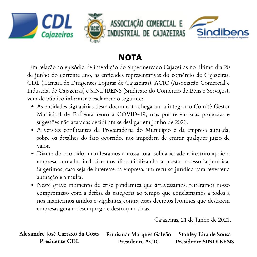 Três entidades que representam comércios e indústrias em Cajazeiras emitiram uma nota em solidariedade a um supermercado que foi multado pela Prefeitura de Cajazeiras por violação do decreto de combate à pandemia do coronavírus.