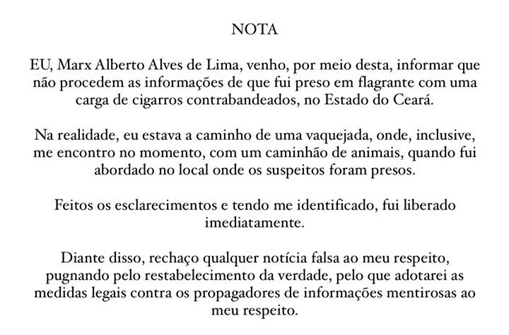 De acordo com Marx Alberto, o que aconteceu foi que ele estava levando animais para uma vaquejada e quando passou pelo local onde os caminhões com os cigarros foram interceptados, a Polícia Rodoviária Federal solicitou que ele parasse para se identificar. Após se identificar e disponibilizar seus dados, ele foi liberado para seguir viagem. Em nota, Marx esclarece o fato e diz que irá acionar meios jurídicos contra quem espalhar fake news.