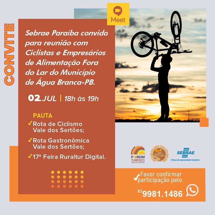 O Sebrae Paraíba está promovendo uma série de reuniões virtuais com empresários do ramo de alimentação fora do lar, ciclistas e secretários municipais de turismo e esporte dos dez municípios que integram o Vale dos Sertões para discutir ações voltadas ao turismo e gastronomia na região. A primeira reunião foi realizada no município de Princesa Isabel e, a próxima, será nesta sexta-feira (2), das 18h às 19h, com o público da cidade de Água Branca.