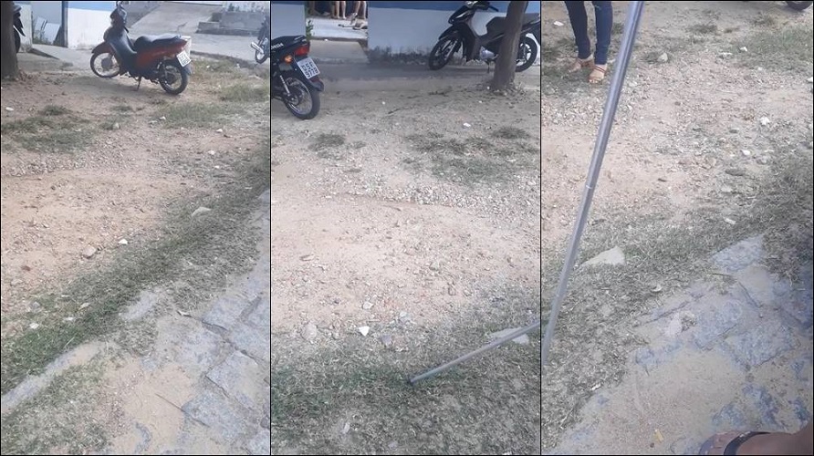 O vídeo mostra uma enfermeira vacinando um deficiente visual praticamente na rua porque não existe uma calçada com rampa para dar acesso ao posto de saúde do bairro Santo Antônio. Na frente do posto o chão é de terra e irregular.
