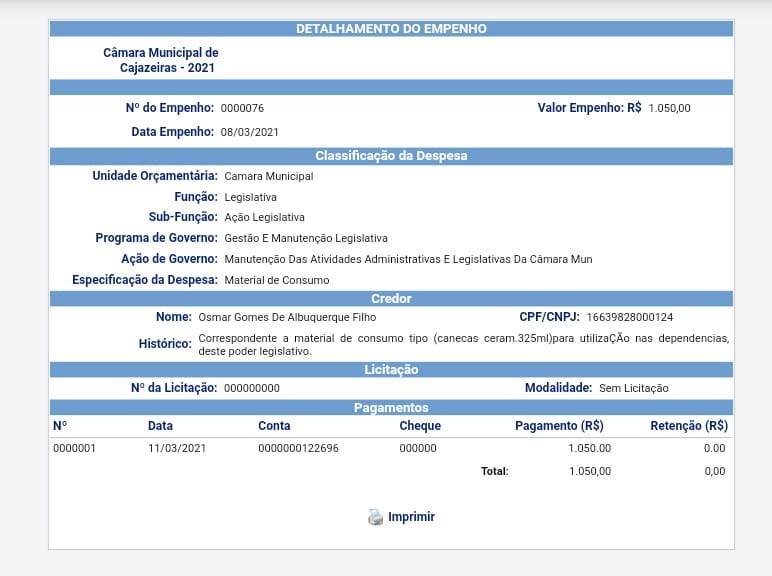 Detalhe é que as canecas foram adquiridas, segundo a nota de empenho n. 0000076 emitida pela Câmara de Vereadores, “para serem utilizadas nas dependências deste Poder Legislativo”, sendo que a Câmara de Vereadores de Cajazeiras não vem realizando sessões presenciais durante este ano de 2021, em face da pandemia do coronavírus.