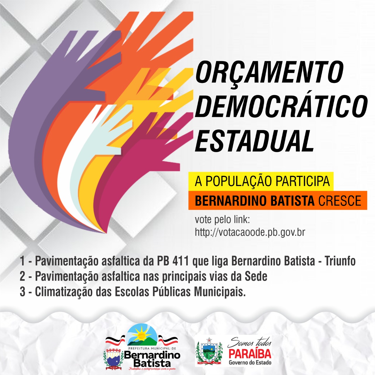 O Orçamento Democrático Estadual da Paraíba – Ciclo 2021 já começou e o município de Bernardino Batista continua participando do processo, podendo ser contemplado com recursos e obras em breve.