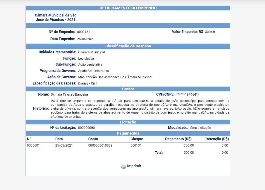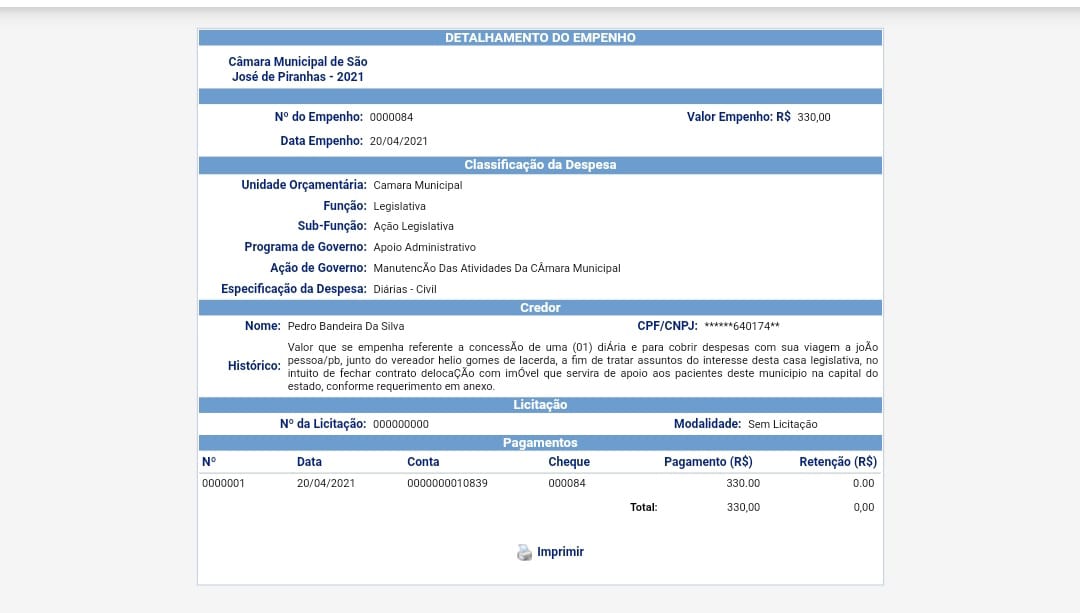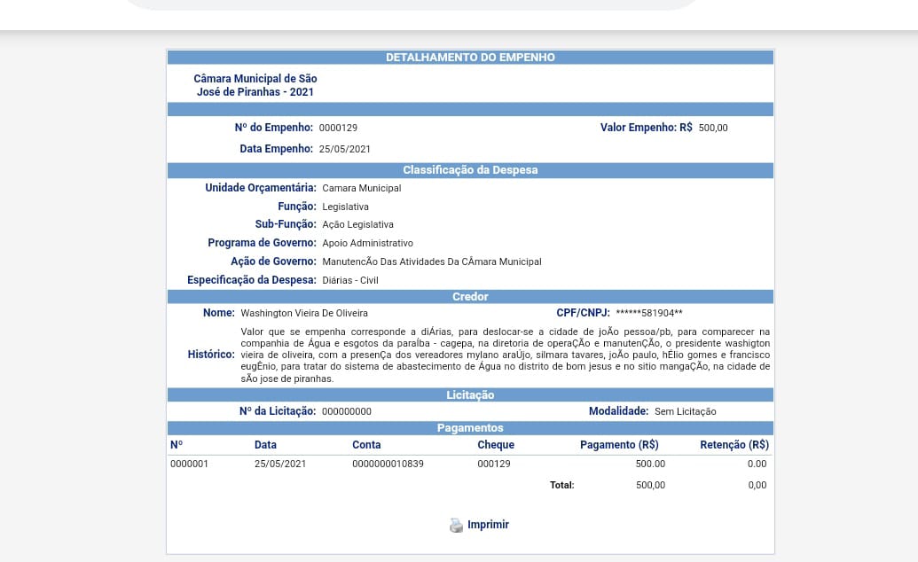 Um levantamento feito pela reportagem do Diário do Sertão verificou que a Câmara de Vereadores do município de São José de Piranhas, no Alto Sertão da Paraíba, que tem como presidente o vereador Washington Vieira de Oliveira (Cidadania), vem realizando gastos com combustível, peças de veículo e diárias concedidas aos vereadores para viagens à capital do estado no mês de maio de 2021.
