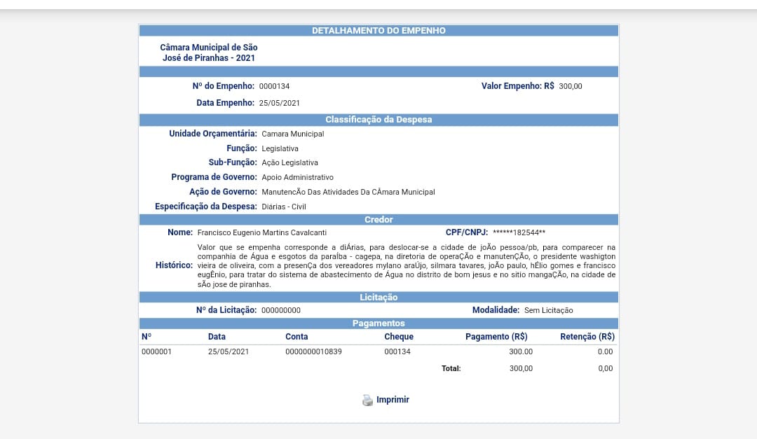Os gastos prosseguem com o pagamento de diárias aos seguintes vereadores: Francisco Eugênio Martins Cavalcante (Cidadania), Francisco Milano Lima de Araújo (Cidadania), Hélio Gomes de Lacerda (PODE), João Paulo da Silva Neto(PL), Pedro Bandeira da Silva (Cidadania), Silmara Tavares Bandeira (Cidadania) e também do presidente da Casa, Washington Vieira de Oliveira, com a finalidade de custear despesas de viagens dos parlamentares citados à cidade de João Pessoa, dentre elas, na data de 25/05/2021, para comparecimento à CAGEPA. Os valores com diárias ultrapassam a casa dos R$ 2.000,00.