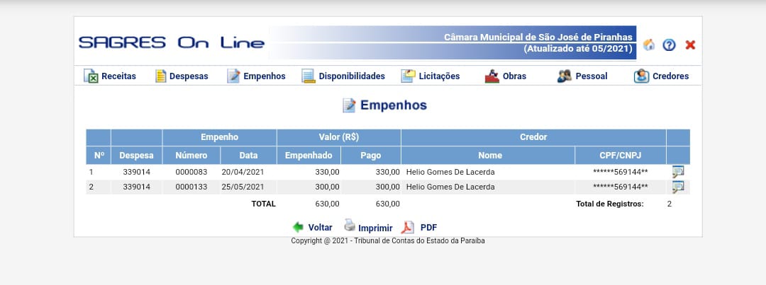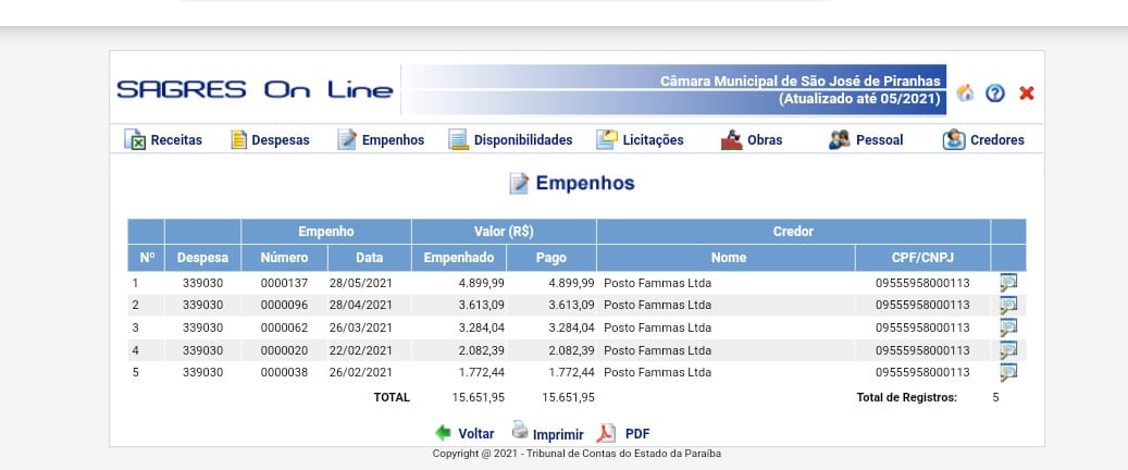 De acordo com as informações do Sagres – sistema de acompanhamento de gestão do TCE, os gastos com combustível para o único veículo da Câmara, de janeiro a maio de 2021, foi de R$ 15.651,95, pagos ao posto Fammas, segundo empenhos emitidos pelo Poder Legislativo piranhense.