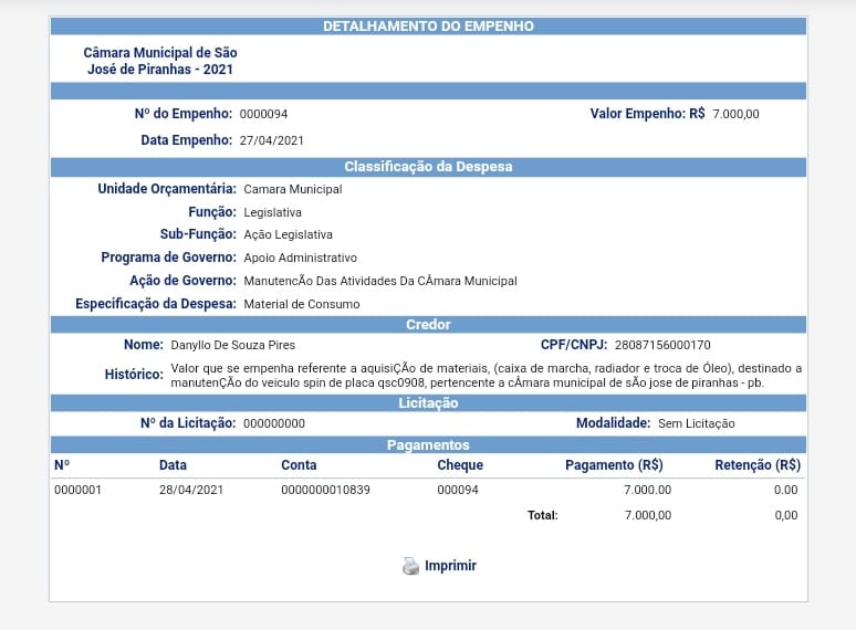 Em outro empenho, consta um gasto de R$ 7.000,00 com caixa de marcha, radiador e troca de óleo do veiculo oficial do parlamento.