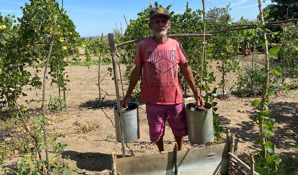 No local, ele e a esposa plantam uma grande variedade de frutas, verduras e legumes. Mas para irrigar é preciso buscar água em um açude distante.