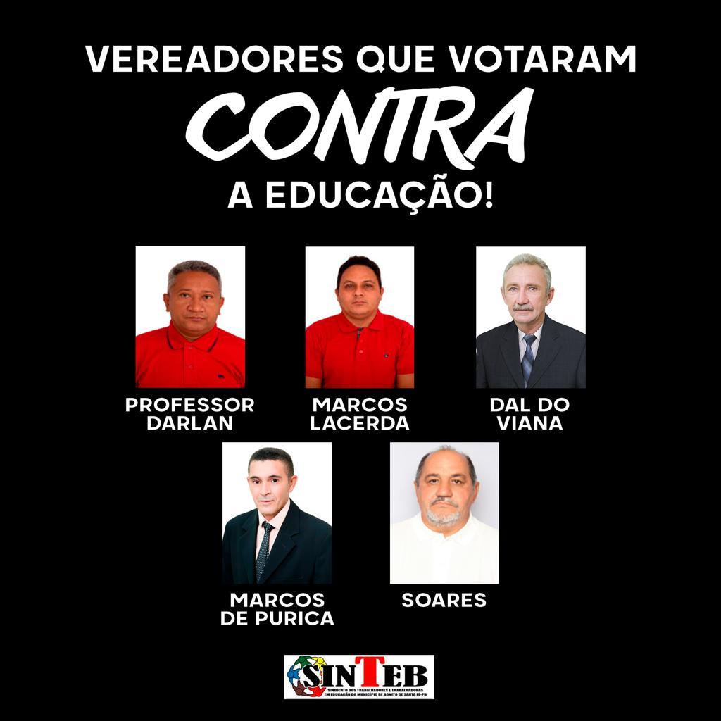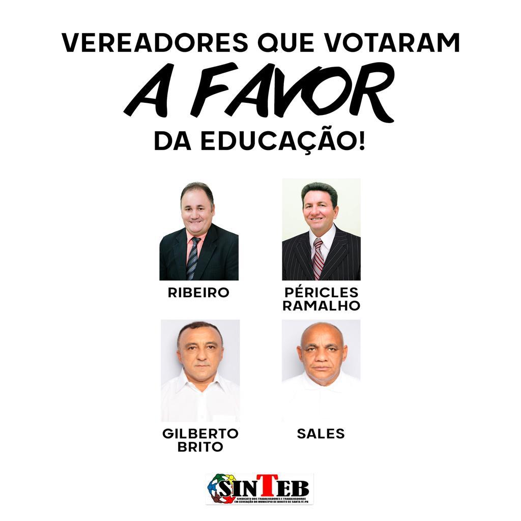 Sindicato dos Trabalhadores em Educação de Bonito de Santa Fé divulgou os nomes e retratos dos vereadores que votaram a favor e contra o projeto