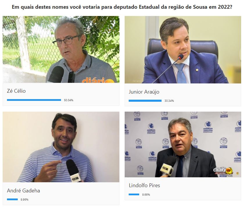 A enquete colocou quatro nomes à disposição. Em segundo lugar ficou o deputado estadual Júnior Araújo (Avante) com 30.34%. Em terceiro ficou o ex-prefeito André Gadelha com 9.96%. Em quarto ficou o deputado estadual Lindolfo Pires com 9.66%.
