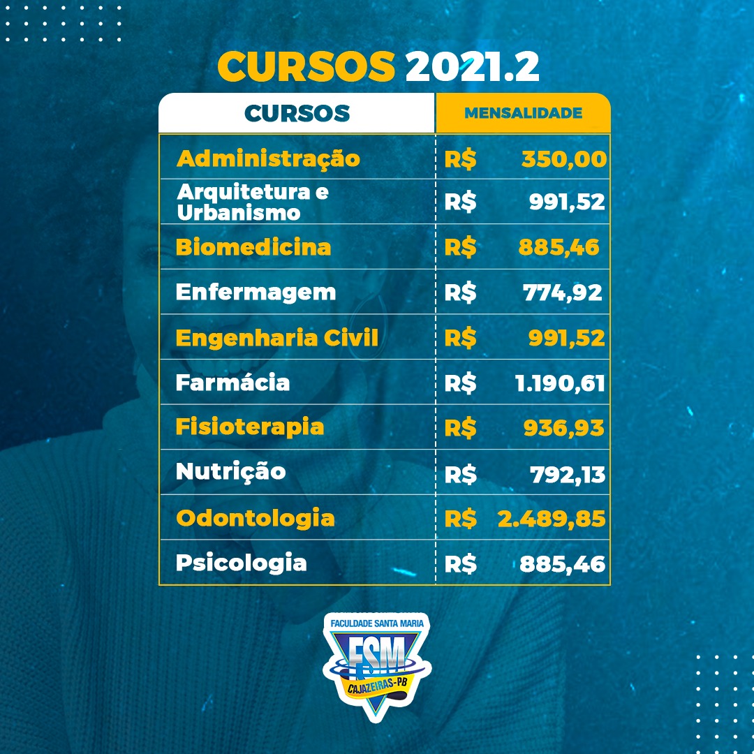 Segundo a professora Iranilda Magalhães, a FSM está trabalhando a responsabilidade social, estabelecendo parcerias com ofertas de bolsas de 50% aos estudantes ingressantes no período 2021.2 nos cursos de graduação elencados abaixo: