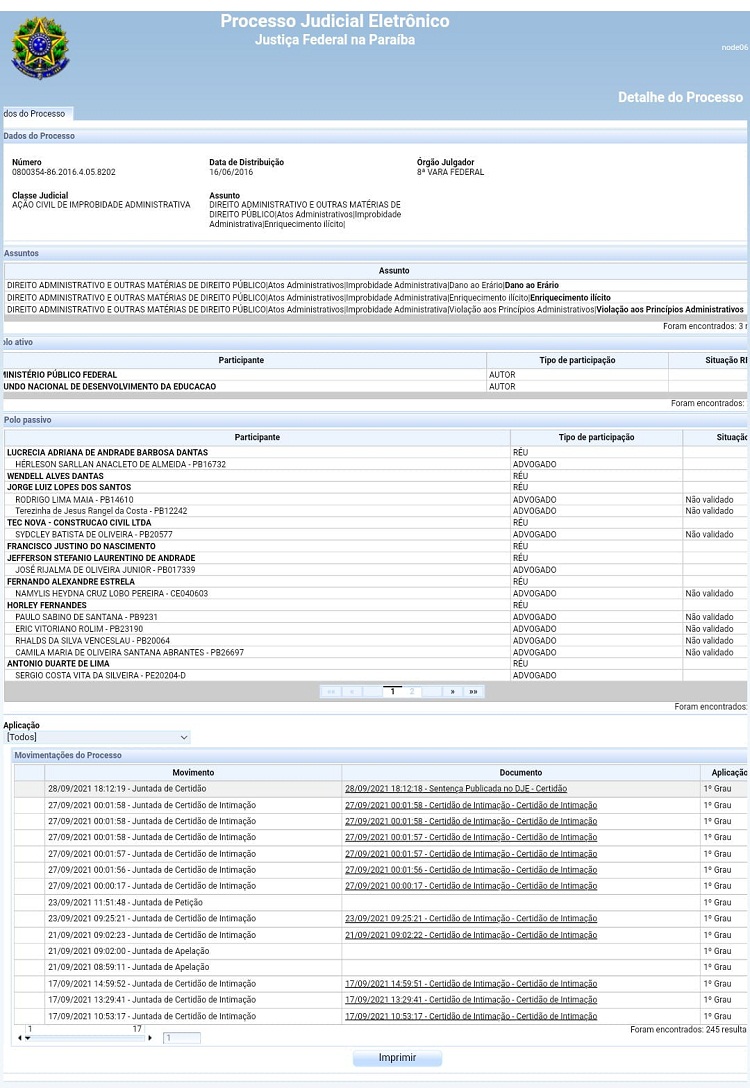 O juiz da 8ª Vara Federal de Sousa, no Sertão paraibano, Dr. Marcos Antônio Mendes de Araújo Filho, proferiu sentença de mérito, em ação civil pública de improbidade administrativa, movida pelo Ministério Público Federal (MPF) e, dessa feita, condenou a ex-prefeita de Joca Claudino, na região de Cajazeiras, Lucrécia Adriana de Andrade Barbosa Dantas, além de Francisco Justino do Nascimento, Tec Nova Construção Civil Ltda, Fernando Alexandre Estrela, Wendell Alves Dantas, Jorge Luiz Lopes dos Santos, Horley Fernandes, Aureliano Batista Duarte, José da Costa Duarte, Cézar Campos Duarte, Jefferson Stefâneo Laurentino de Andrade, Carlos Alberto Martins e Francisco Luan Borges Cassiano.