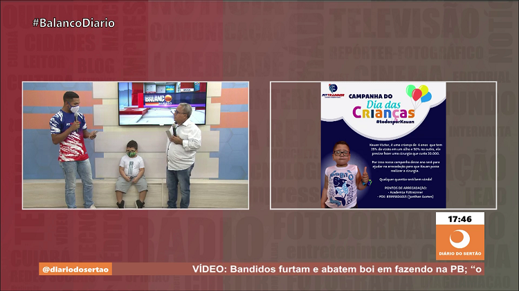 O Educador Físico Etoo Gomes, participou do programa Balanço Diário da TV Diário do Sertão e apresentou uma campanha para arrecadar fundos para realizar uma cirurgia em uma criança de 6 anos. Trata-se do pequeno Kauan Victor que tem apenas 30% da visão em um olho e 25% no outro.