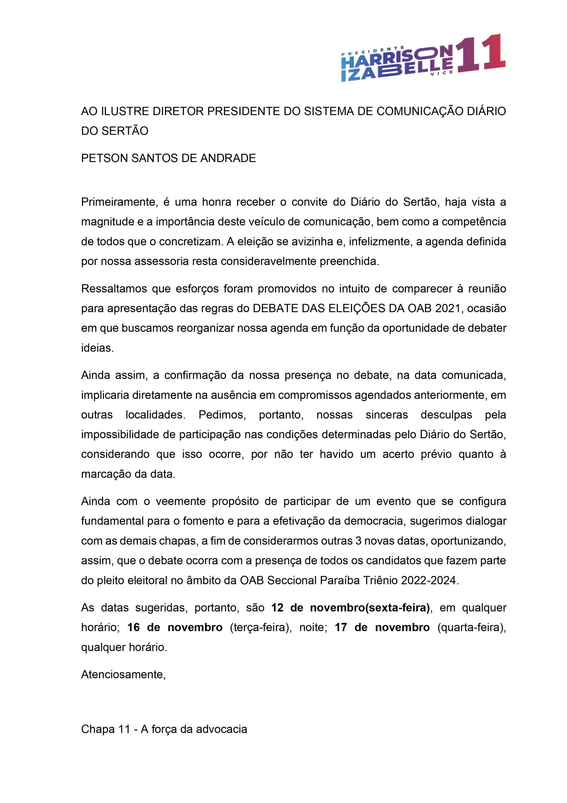 O candidato à presidência da Ordem dos Advogados do Brasil (OAB) – Seccional da Paraíba, Harrison Targino, enviou uma nota de esclarecimento ao Diário do Sertão justificando o motivo pelo qual nenhum representante da sua chapa participou da reunião para definir as regras do debate com os candidatos que será realizado pela TV Diário do Sertão no próximo dia 5 em Cajazeiras.
