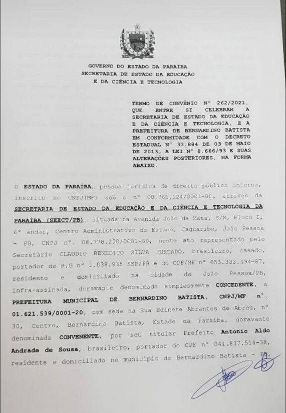 O prefeito de Bernardino Batista, Aldo Andrade (Cidadania), assinou na sexta-feira (05) um convênio para construção de um ginásio poliesportivo na Vila Egídio, zona rural do município. A obra está orçada em R$ 520 mil.