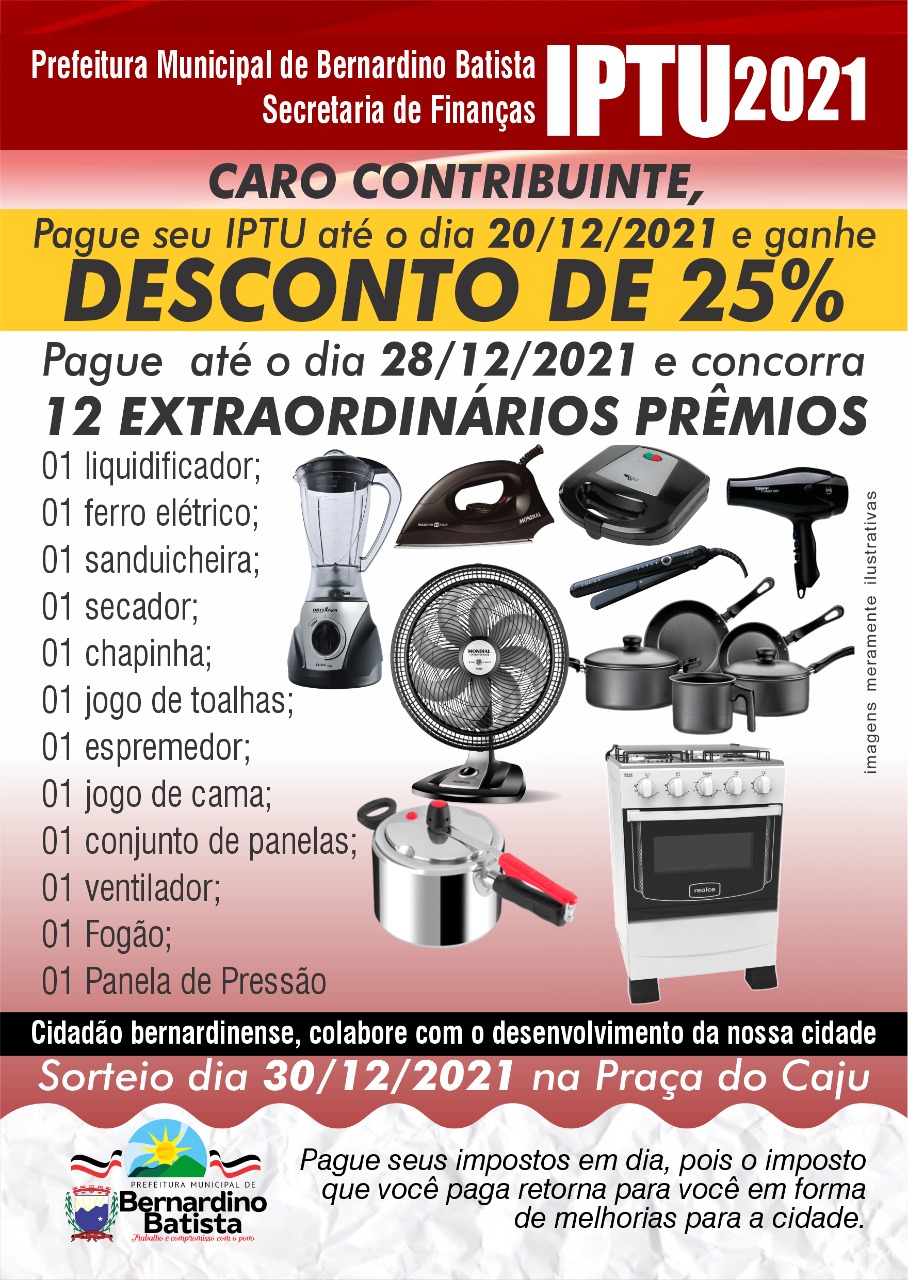A prefeitura ainda informa a todos que, quitando o IPTU, o contribuinte além de contribuir para o crescimento da cidade ainda concorrerá, este ano aos 12 seguintes valiosos prêmios: 01 liquidificador, 01ferro elétrico, 01 sanduicheira, 01 secador, 01 chapinha, 01 jogo de toalhas, 01 espremedor, 01 jogo de cama, 01 conjunto de panelas, 01 ventilador, 01 fogão, 01 panela de pressão.