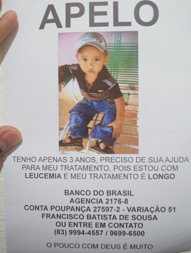 Os pais da criança são moradores do Sítio Frade, município de Itaporanga e pedem a ajuda de amigos e interessados nesta causa através de panfletagens pelas ruas da cidade. Eles disseram que a Prefeitura itaporanguense já está ajudando no tratamento com o fornecimento do transporte.