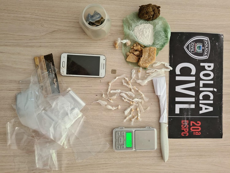 Durante buscas na residência do suspeito, os policiais encontraram cerca de 60 gramas de substância análoga a crack, 25 pedras da mesma droga, 15 gramas de cocaína, 11 pacotinhos da mesma substância, 20 gramas de maconha, uma balança de precisão, um celular e vários sacos de “dindin” que são utilizados para embalar drogas.