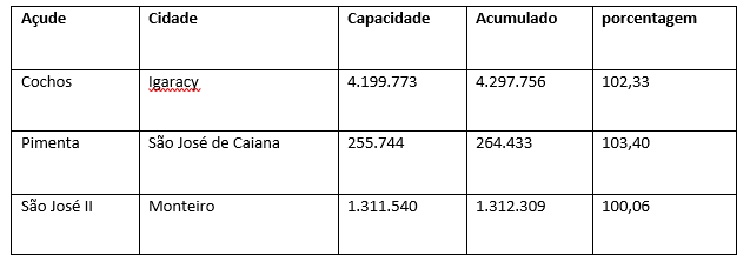 O açude Cachoeira da Vaca, localizado em Cachoeira dos Índios, na região de Cajazeiras que tem capacidade de 339.156 metros cúbicos, alcançou 355.556, passando de sua capacidade normal; outro manancial do Alto Sertão que também está sangrando é o São José I, em São José de Piranhas. Conhecido como Açude da Cagepa, ele suporta 3.051.125 metros cúbicos e está com 3.299.862, ou seja, ultrapassou a média normal e está com 108,15%, com um volume a mais de sua capacidade.