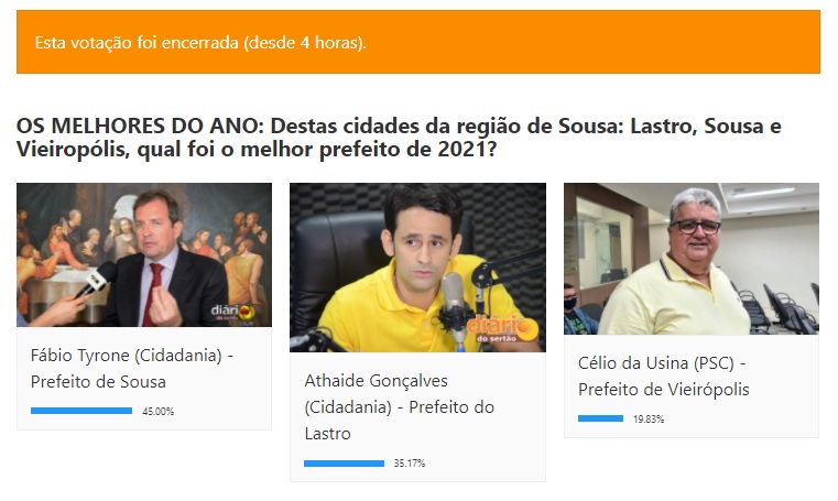 Fábio Tyrone obteve 45% dos votos dos internautas, seguido de Athaide Gonçalves (Cidadania), prefeito do Lastro (35.17%) e Célio da Usina (PSC), prefeito de Vieirópolis (19.83%).