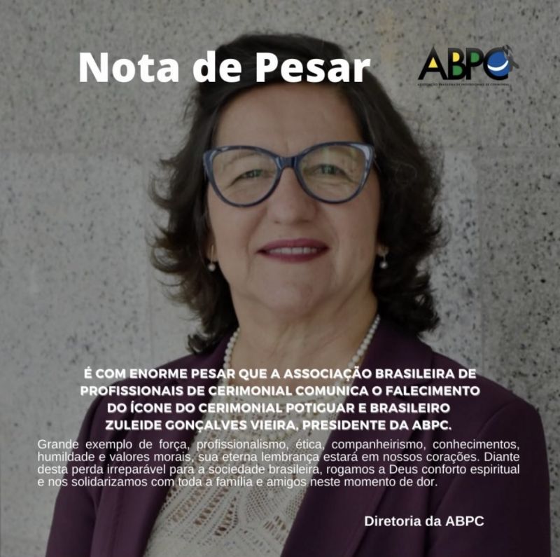 Com grande pesar que lamento o falecimento de Zuleide Gonçalves Vieira, presidente e fundadora da Associação Brasileira dos Profissionais de Cerimonial (ABPC) e chefe do Cerimonial do Legislativo Potiguar. Pessoa querida, afável e sempre atenciosa aos detalhes nas solenidades e na relação com todos. Referência nacional, Zuleide deixa uma grande lacuna no setor por seu legado e exemplo.