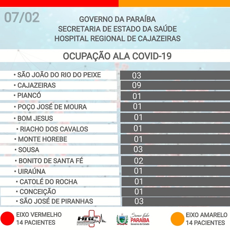 O Hospital Regional de Cajazeiras registrou neste domingo (06), nove óbitos provocados pela covid-19. Segundo a assessoria da unidade, quatro pacientes são de Cajazeiras. Os demais são das cidades de Monte Horebe, Joca Claudino e São João do Rio do Peixe, todas no Alto Sertão; Piancó, no Vale do Piancó e Condado, da região de Patos, todas com uma morte cada.