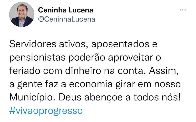 O prefeito Ceninha Lucena (Podemos), anunciou nesta quinta-feira (24) o pagamento dos servidores ativos, aposentados e pensionistas do município referente ao mês de fevereiro de 2022.