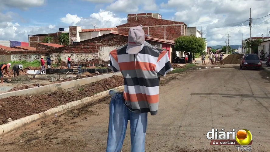 Para chamar a atenção da gestão, o jeito foi improvisar. Os moradores fizeram placa e boneco, que demonstram a insatisfação do povo com a administração pública.