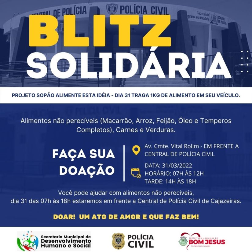 A Secretaria Municipal de Desenvolvimento Humano e Social de Bom Jesus, em parceria com a Polícia Civil, através da 20ª Delegacia Seccional, com sede em Cajazeiras, estará realizando na quinta-feira, dia 31, a primeira blitz solidária, em apoio ao “Projeto Sopão – Alimente essa Ideia”, em prol de famílias em situação de vulnerabilidade social e alimentar.
