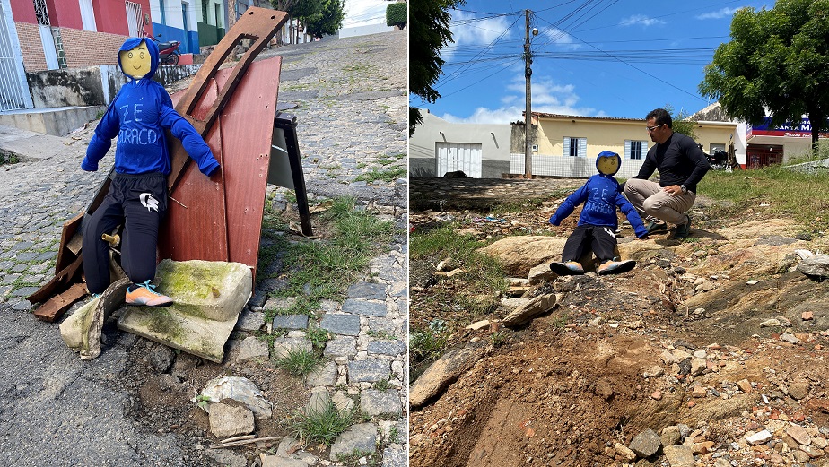 VÍDEO: Série especial de reportagens com o boneco “Zé Buraco” mostra problemas nas ruas de Cajazeiras