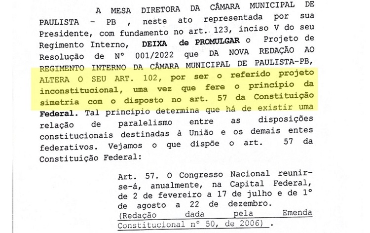 A Câmara de vereadores de Paulista, na região de Pombal, no Sertão paraibano, voltou atrás e resolveu revogar a decisão tomada pela maioria dos parlamentares em sessão da última terça-feira (17), onde os vereadores, em sua maioria, teriam votado a favor da alteração da Lei Orgânica para aumentar o recesso deles próprios para 105 dias, divididos em dois períodos.