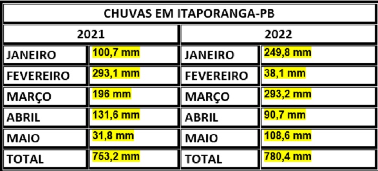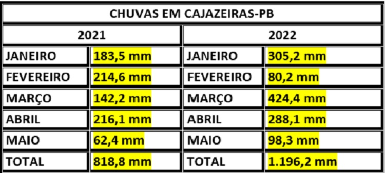 Os dados pluviométricos registrados em Cajazeiras nos cinco primeiros meses de 2022 ultrapassam consideravelmente o valor acumulado no mesmo período do ano passado. De janeiro até o final de maio, a cidade registrou 1.196,2 milímetros de chuva, 377,4 mm a mais que o mesmo período do ano passado. Nos primeiros cinco meses de 2021 foram registrados 818,8 mm.