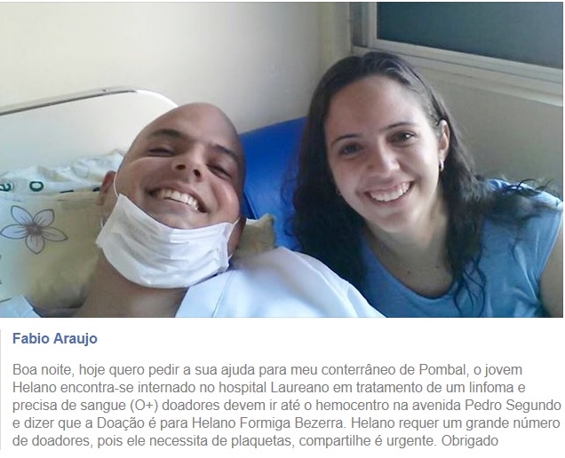 O jovem pombalense Helano Formiga Bezerra, de 25 anos, está internado no Hospital Napoleão Laureano em João Pessoa, realizando tratamento de uma leucemia no sistema linfático e precisa urgentemente de sangue, tipo 'O Positivo'