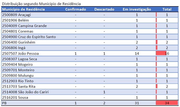 Conforme a SES, em todo o estado são 31 casos sendo investigados. A maioria dos casos são em pessoas na faixa etária de 20 a 29 anos. O maior número de registros é em João Pessoa. Até o momento apenas um caso foi confirmado, sendo de uma jovem de 22 anos, da Capital paraibana.