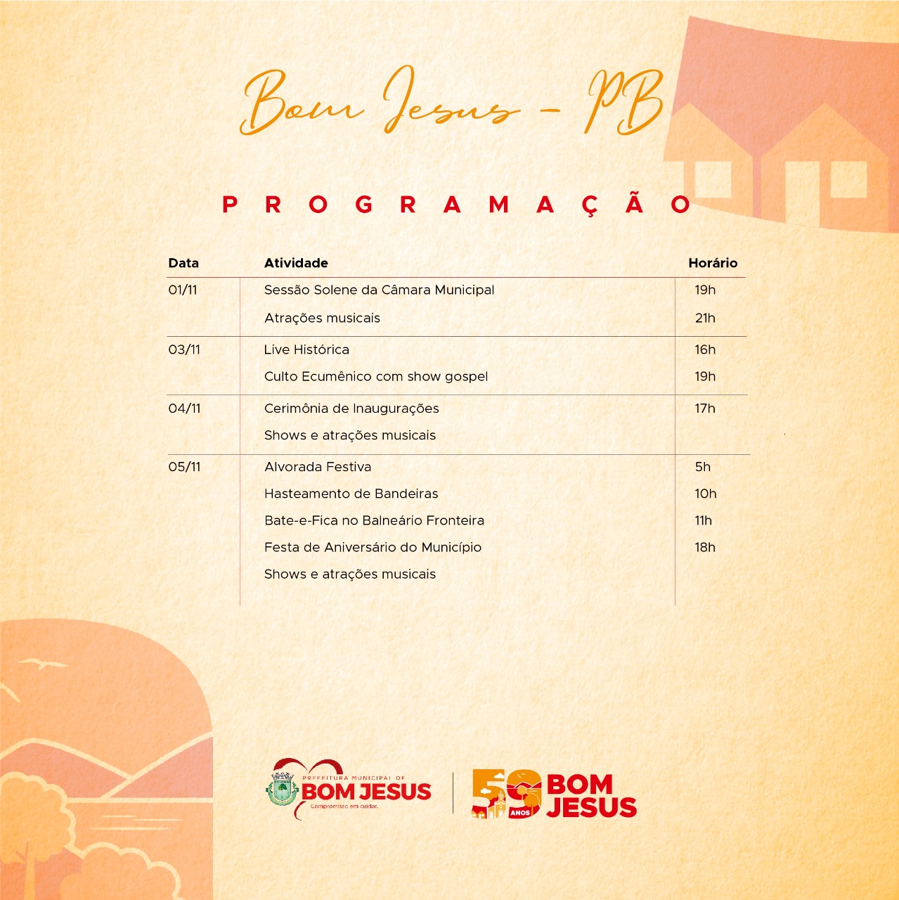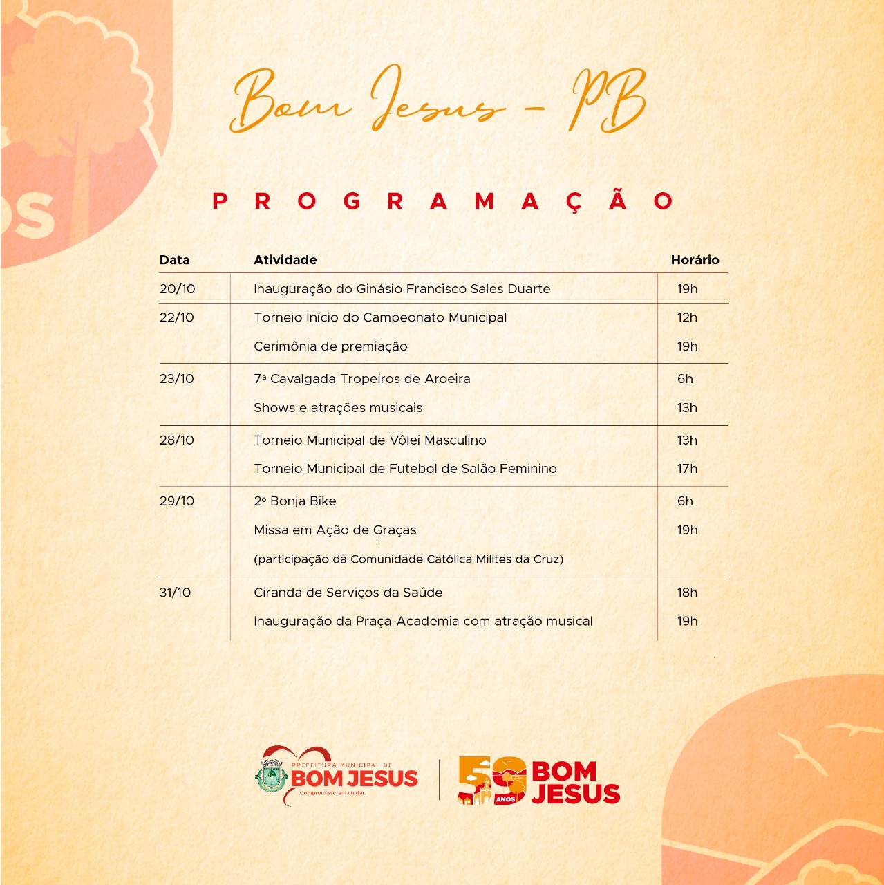 A programação, que se estenderá até do dia 5 de novembro, data de emancipação de Bom Jesus, começa nesta quinta-feira (20) com a entrega de padrões esportivos para equipes que participarão de um torneio de futebol de campo no dia 22. Cerca de 200 atletas receberão camisas, shorts, meiões e chuteiras. Ainda na ocasião, a gestora municipal estará entregando a reforma do ginásio Francisco Sales Duarte.