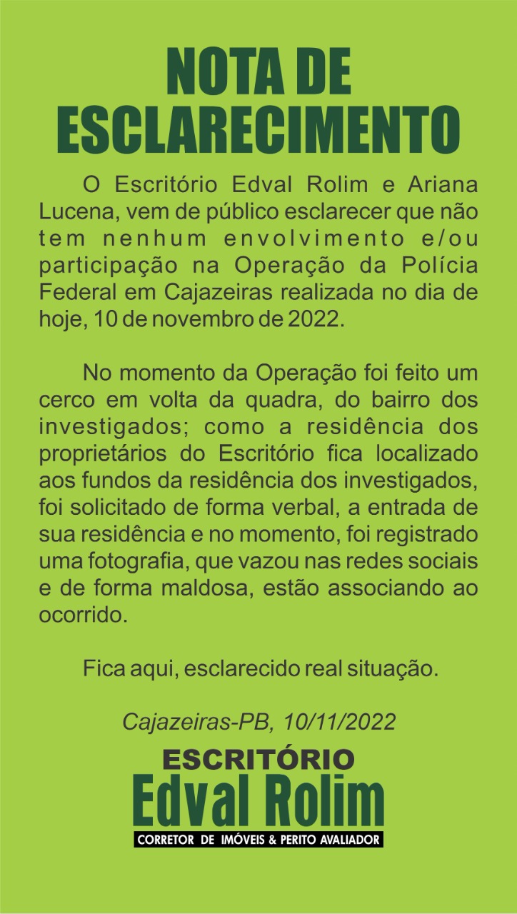 Através de uma nota de esclarecimento, o Escritório Edval Rolim explicou que seu proprietário não tem nenhuma ligação com a operação da PF e que o boato circulou após o vazamento de uma foto.